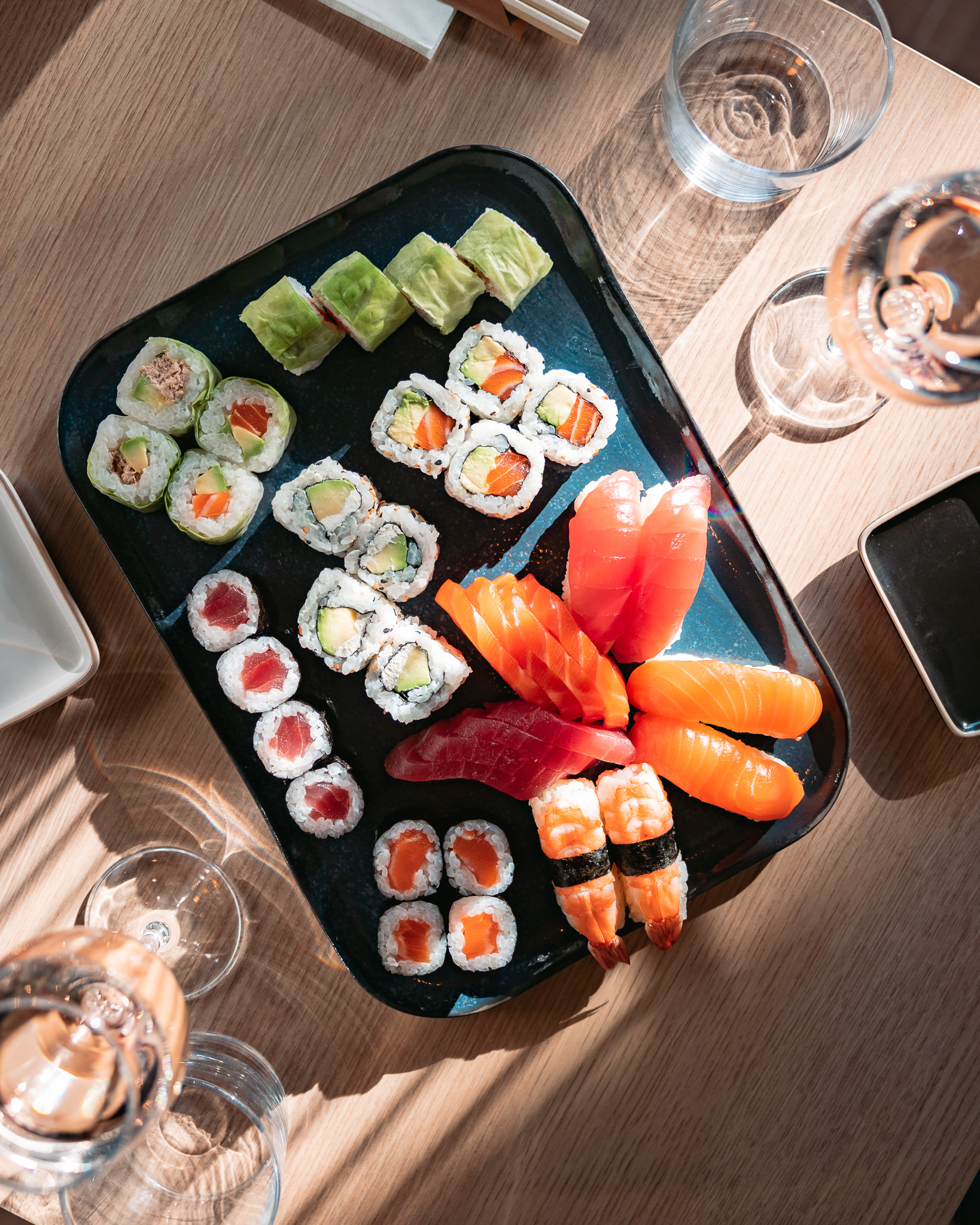 Plateau à partager 38 pièces: 8 maki (4 saumon, 4 thon), 8 california (4 saumon avocat, 4 avocat cheese), 8 spring (4 saumon avocat, 4 thon cuit avocat), 8 sashimi (4 saumon, 4 thon), 6 nigiri (2 saumon, 2 thon, 2 crevette).
